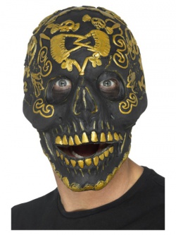 Pojmy spojené s tímto produktem: maska, černá, zlatá, skull, lebka, doplněk kostýmu, Halloween, pohyblivá čelist |