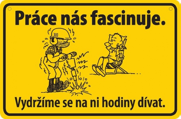 Vtipná cedulka: Práce nás fascinuje. Vydržíme se na ni hodiny dívat