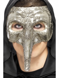 Stříbrná luxusní maska se zdobením a dlouhým nosem na bály a maškarní plesy.