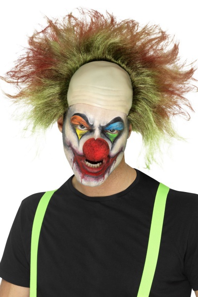 Halloweenská barevná paruka s pleší pro zlého klauna. Strašidelný doplněk klaunského kostýmu.